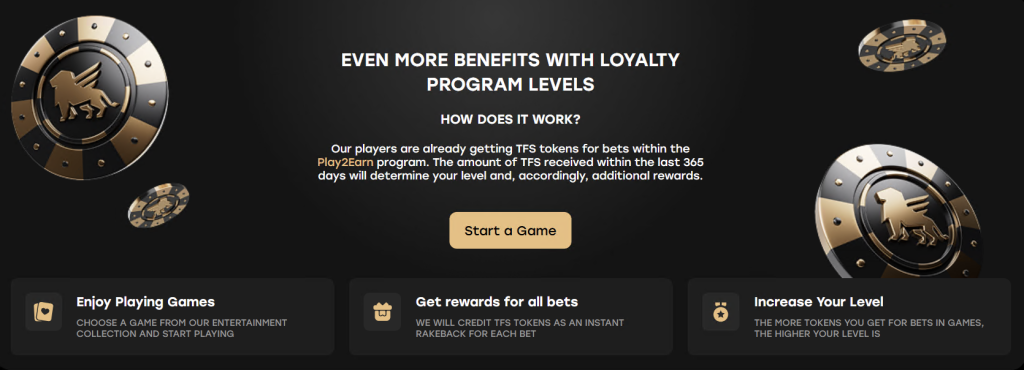 | Loyalty Points (TFS) | Regular players can earn TFS tokens, which can be exchanged for various bonuses and gifts. |