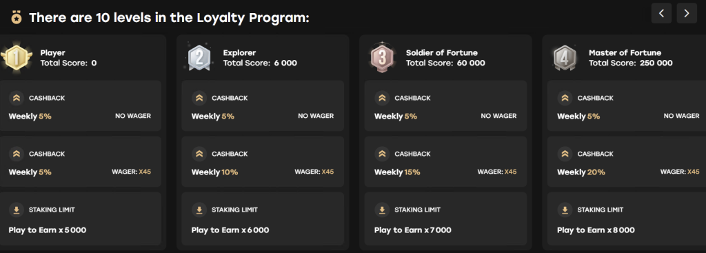 To join the VIP program, you generally need to be an active player, and based on the loyalty points you collect, you gradually become a VIP member. The VIP levels offer different advantages, and the higher level you reach, the more exclusive offers you receive, including up to 10% daily wager-free cashback at the highest tier.
